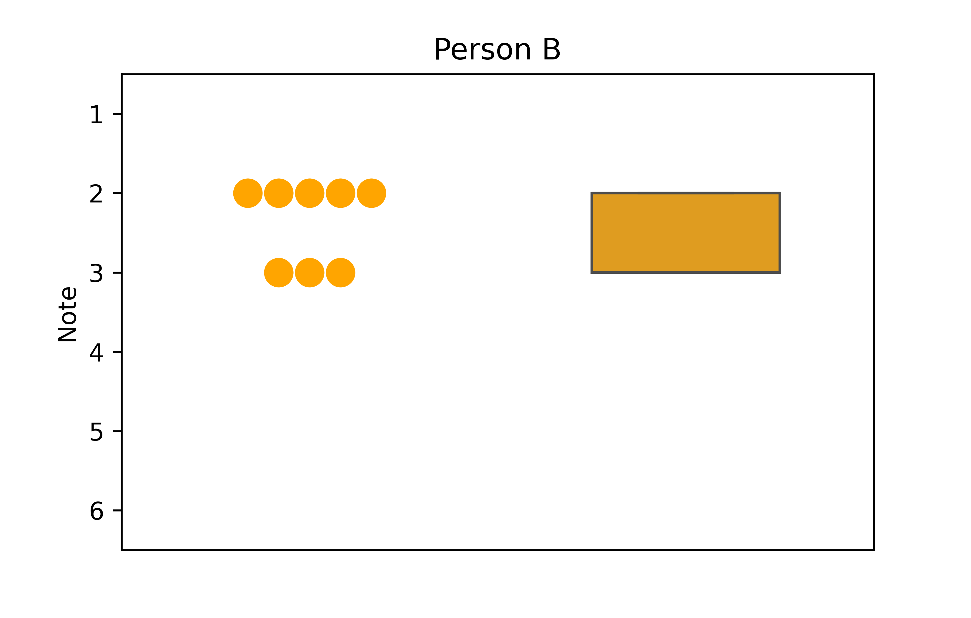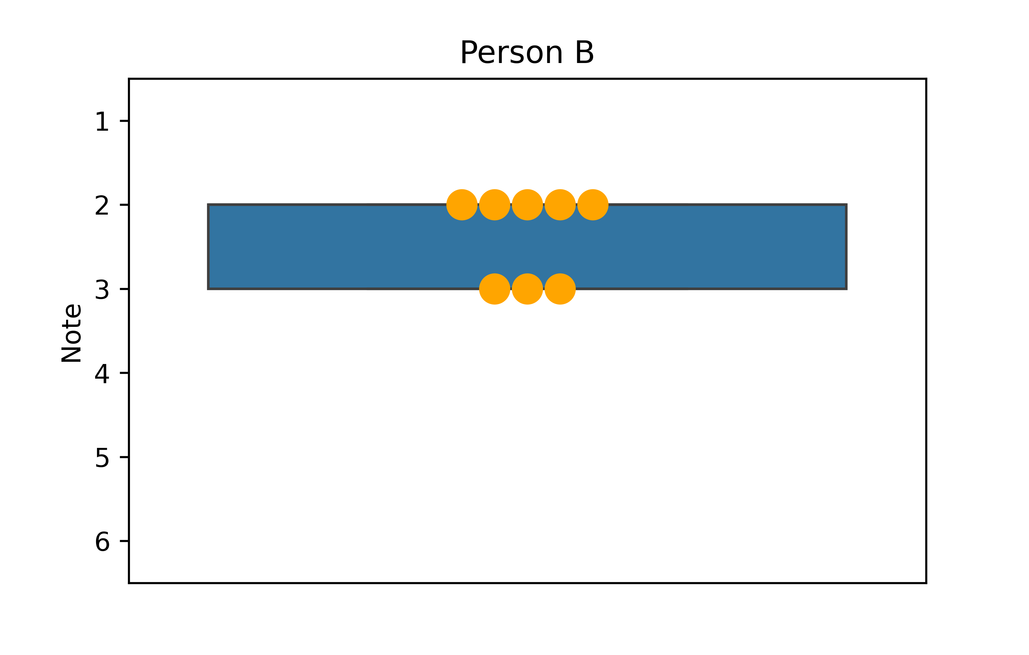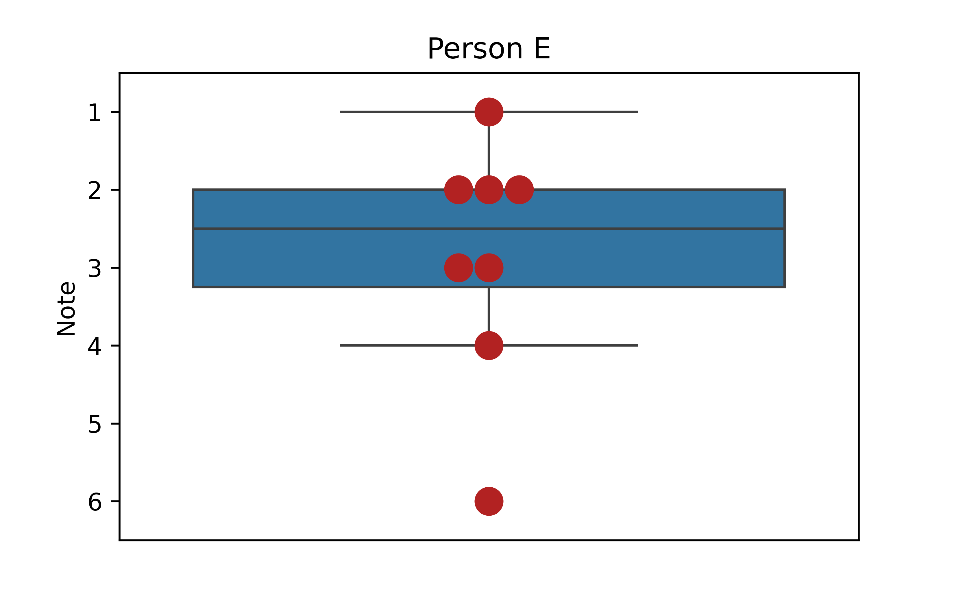 Es fällt auf, dass der Box-Plot für Person B nur aus einer Box zu bestehen scheint. Das liegt daran, dass die Daten von Person B nur aus zwei verschiedenen Noten bestehen, nämlich 2 und 3. Als Resultat sind die Spannweite und IQA identisch, sodass es keine Whisker gibt. Außerdem ist der Median auch 2, entspricht also dem Minimum, sodass es auch keine Linie innerhalb der Box gibt. Der Plot ist also korrekt gezeichnet und zeigt korrekt an, dass die Daten von Person B nicht besonders gestreut sind.