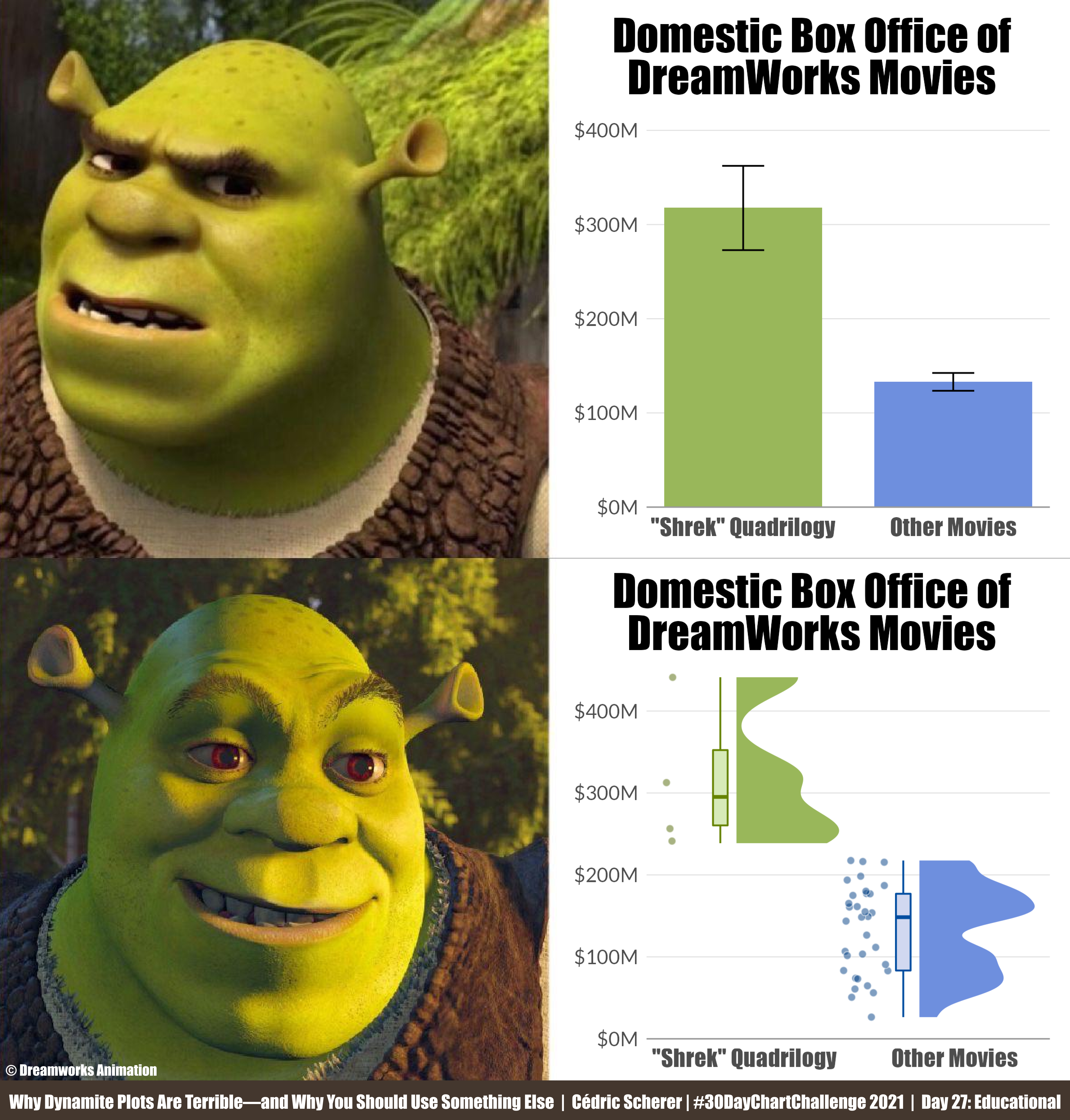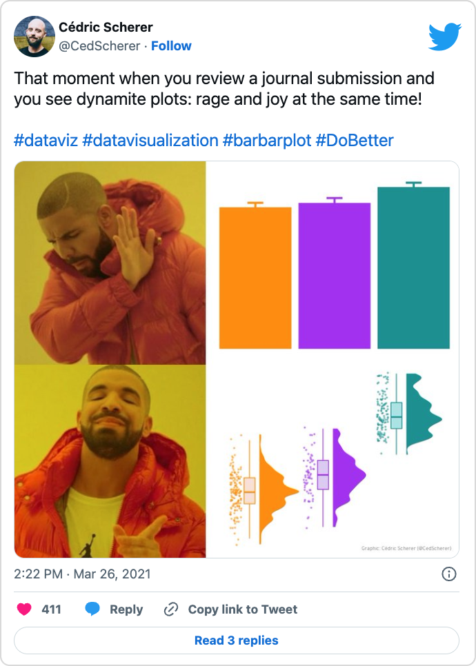 Diese Kritik an den klassischen Balkendiagrammen mit Fehlerbalken ist nicht neu und wird von Experten der Datenvisualisierung regelmäßig geäußert. Die Balkendiagramme mit Fehlerbalken werden in dem Zuge aufgrund der Ähnlichkeit zu Dynamitstangen auch etwas abfällig als “Dynamite Plots” bezeichnet. Eine ausführliche Diskussion dazu findet sich in den weiteren Ressourcen (unten). Es gibt auch Memes zum Thema: