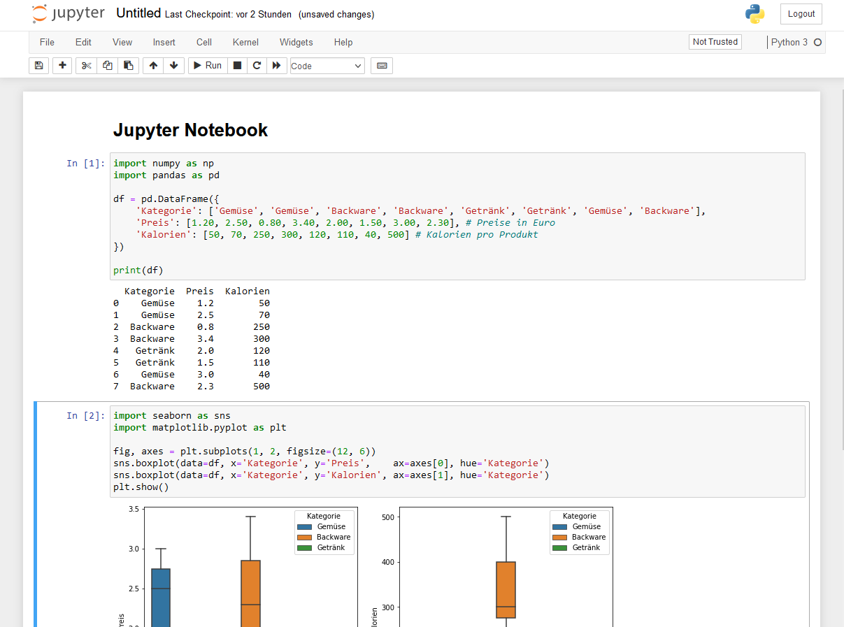 Schließlich können wir die Tabelle auch direkt an Matplotlib und Seaborn übergeben, um sie zu visualisieren. Hier ein Beispiel, wie wir Boxplots für Preis und Kalorien pro Kategorie erstellen könnten: