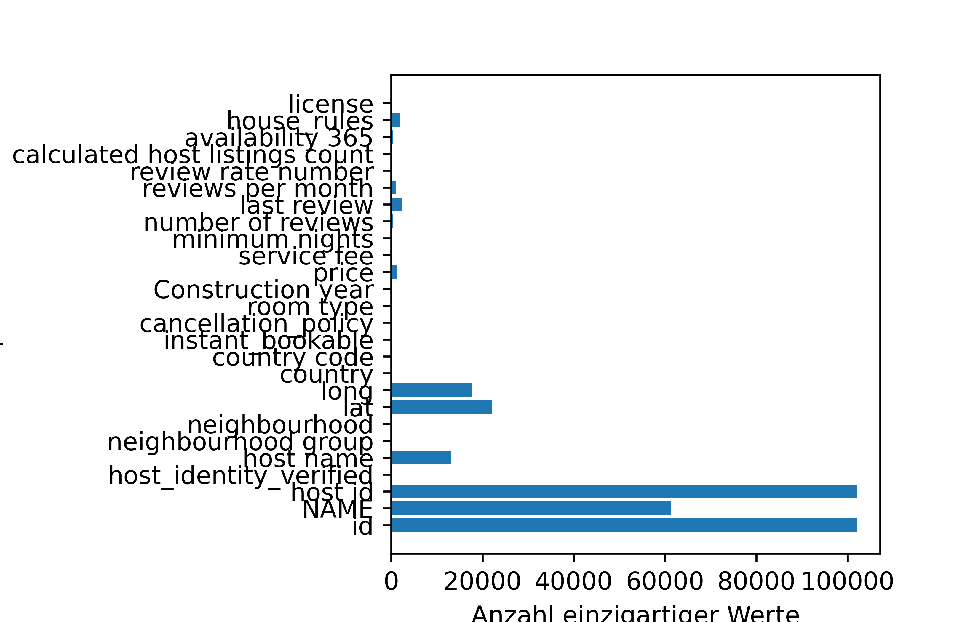 Für unseren AirBnB Datensatz können wir die Anzahl einzigartiger Werte pro Spalte wie folgt in einem Balkendiagramm darstellen. Das Balkendiagramm ist in diesem Fall horizontal, da wir .barh() anstelle von .bar() verwenden.